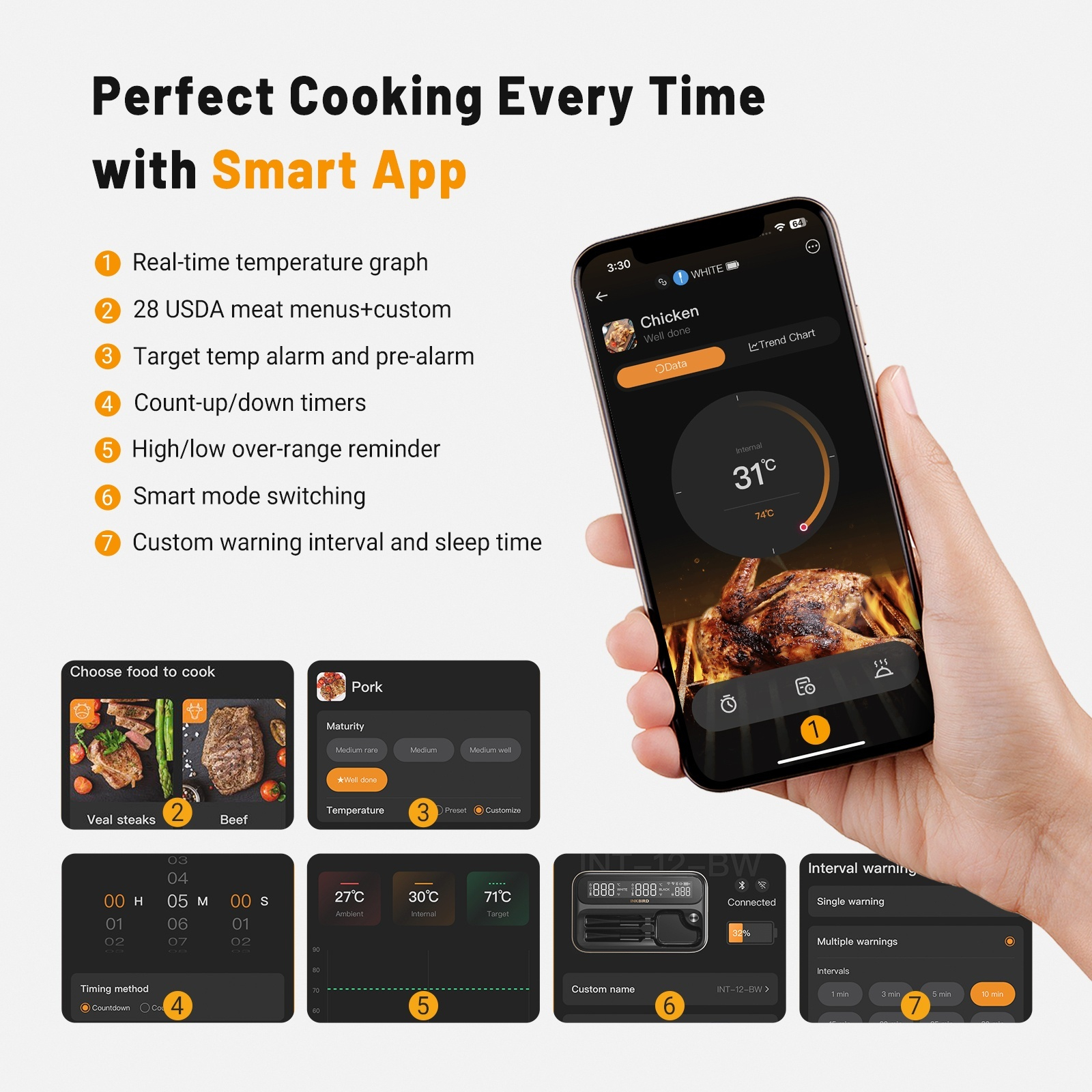 Doeltemperatuuralarmen, kooktimers en waarschuwingen voor perfectie bij elk gerecht.