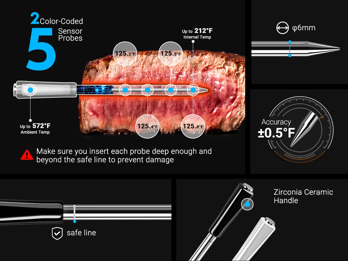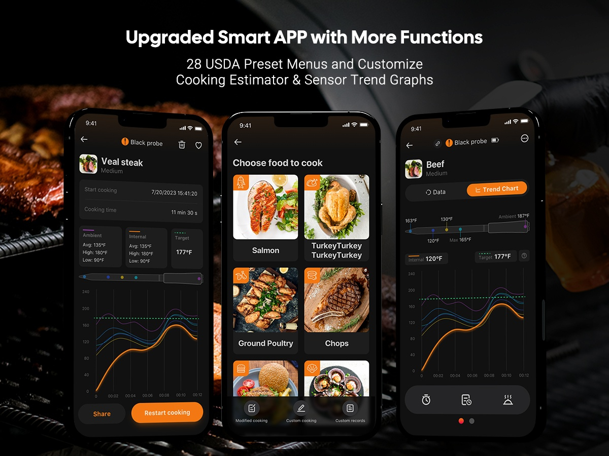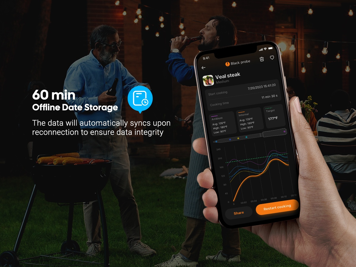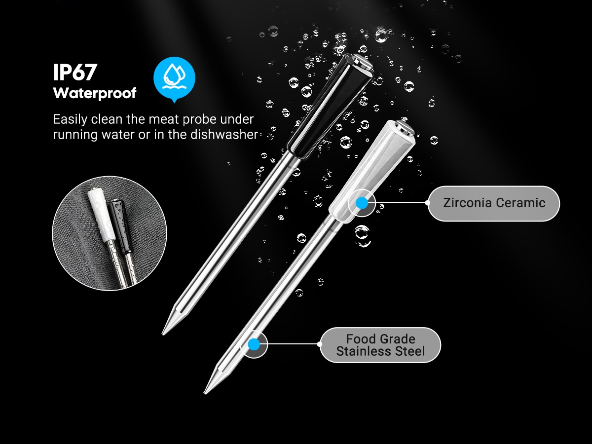 ● WiFi 5G en Bluetooth 5.4 dual-mode verbinding, automatische omschakeling ● Dubbele zwart-wit probes ● 5 zeer nauwkeurige sensoren in 1 probe ● Ultrasnelle responstijd van 1 seconde met hoge nauwkeurigheid van ±0,5℉/±0,3℃ ● HD LCD-scherm met instelbare helderheid ● Sterke magneten aan de achterkant van de basis ● 60 minuten offline opslag van temperatuurgegevens ● Temperatuurkalibratie gecertificeerd door CTI (CNAS-geaccrediteerd laboratorium) ● 28 soorten door USDA aanbevolen vleesmenu's met aangepaste ● Alarmen voor hoge/lage voedsel- en omgevingstemperatuur op zowel telefoon als Apple Watch ● Snel opladen van 25 minuten met 25 uur continue batterijduur ● IP67 waterdichte probe, vaatwasser beschikbaar, gemakkelijk schoon te maken ● Ondersteuning voor OTA-firmware-updates