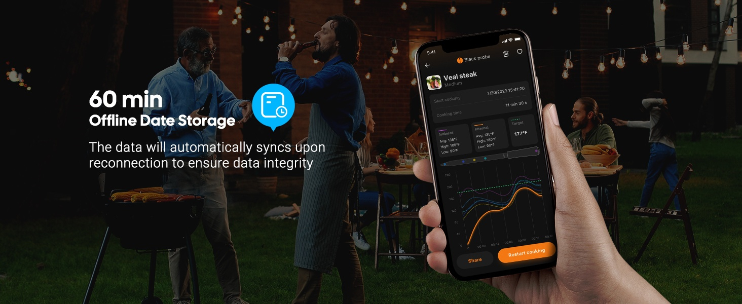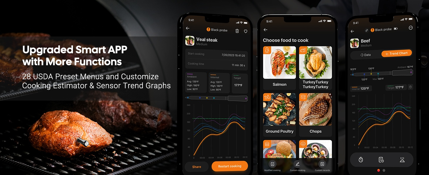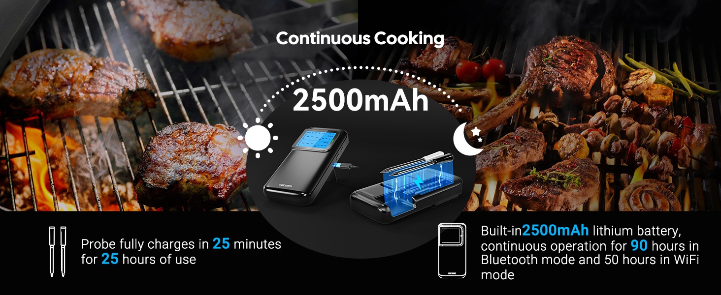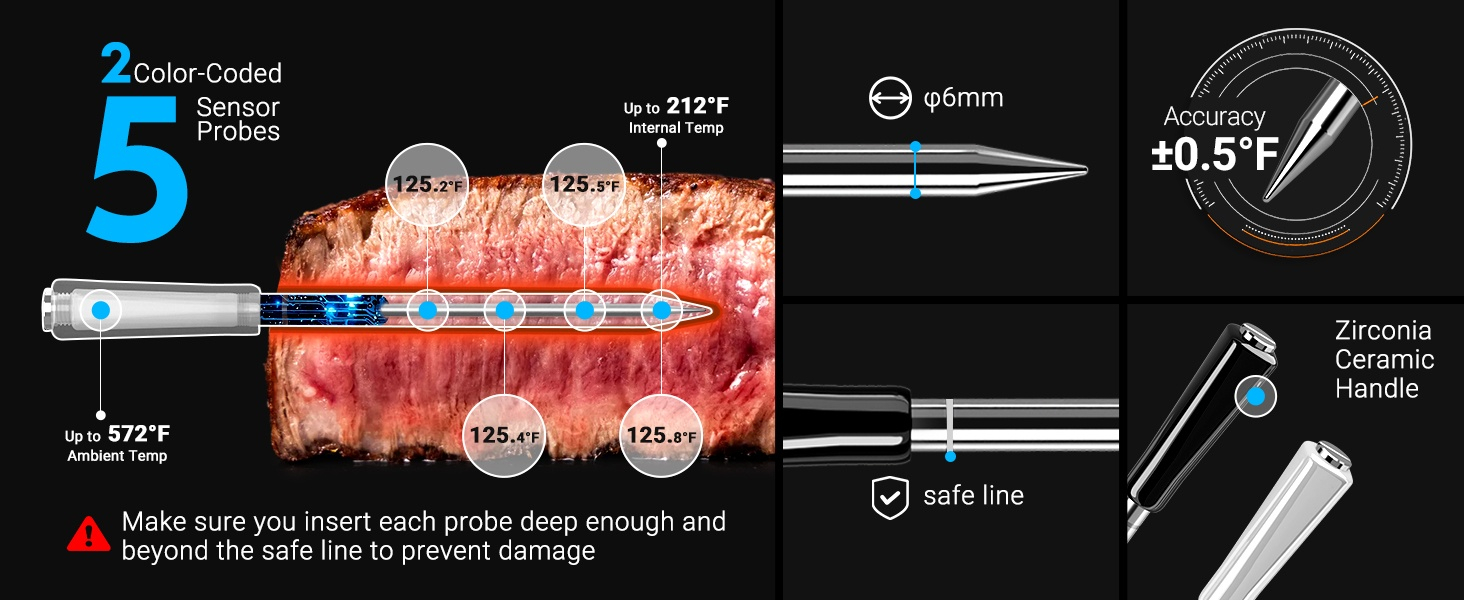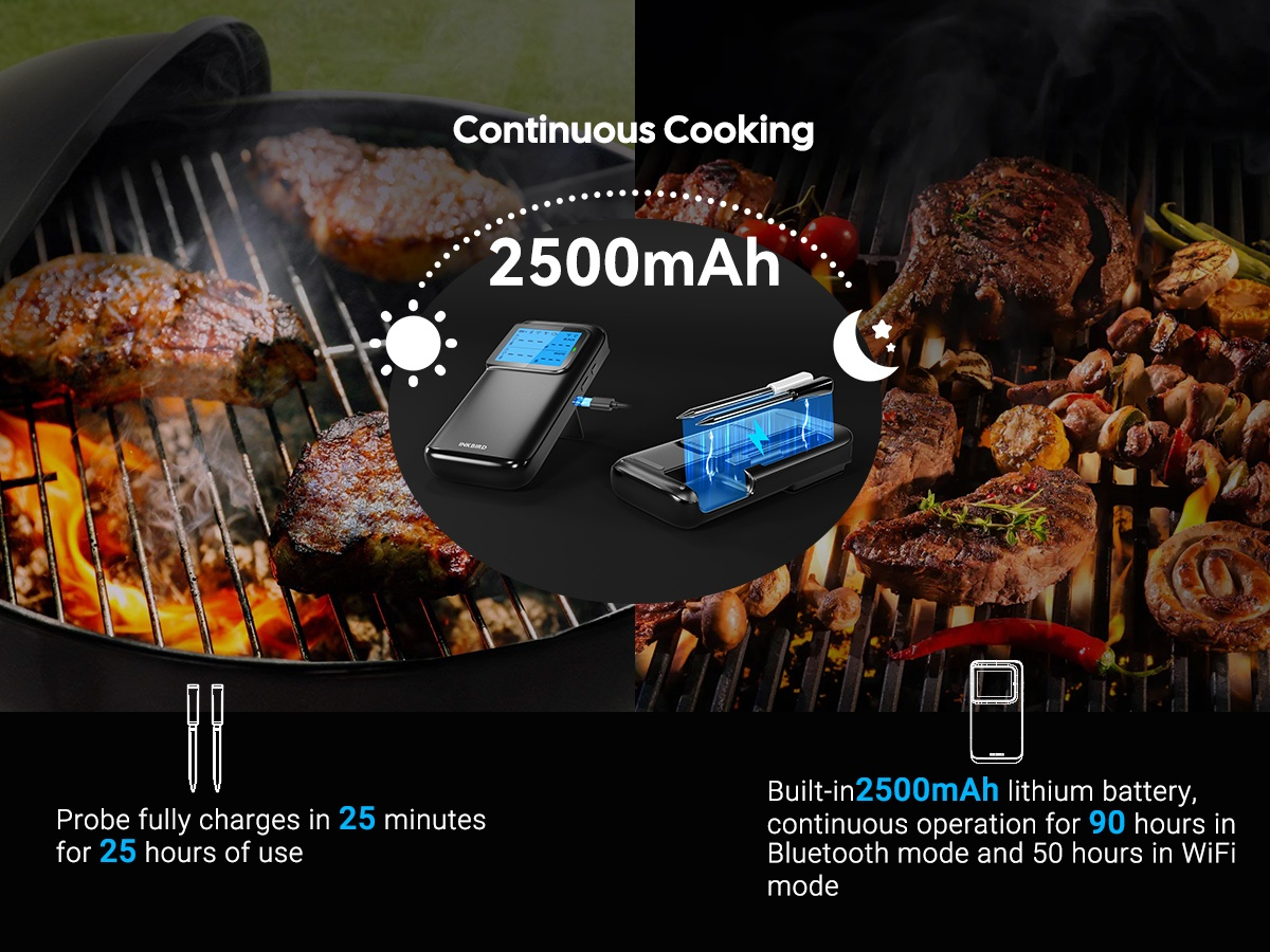 ● WiFi 5G en Bluetooth 5.4 dual-mode verbinding, automatische omschakeling ● Dubbele zwart-wit probes ● 5 zeer nauwkeurige sensoren in 1 probe ● Ultrasnelle responstijd van 1 seconde met hoge nauwkeurigheid van ±0,5℉/±0,3℃ ● HD LCD-scherm met instelbare helderheid ● Sterke magneten aan de achterkant van de basis ● 60 minuten offline opslag van temperatuurgegevens ● Temperatuurkalibratie gecertificeerd door CTI (CNAS-geaccrediteerd laboratorium) ● 28 soorten door USDA aanbevolen vleesmenu's met aangepaste ● Alarmen voor hoge/lage voedsel- en omgevingstemperatuur op zowel telefoon als Apple Watch ● Snel opladen van 25 minuten met 25 uur continue batterijduur ● IP67 waterdichte probe, vaatwasser beschikbaar, gemakkelijk schoon te maken ● Ondersteuning voor OTA-firmware-updates