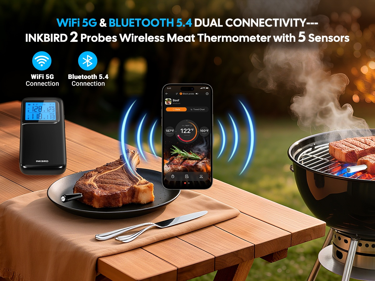 Ontdek de Inkbird Dual Mode & Multi-Sensor Ultra 2026 de nieuwste generatie slimme vleesthermometer die jouw kookervaring naar een hoger niveau tilt. Of je nu grilt, rookt of braadt – deze draadloze thermometer zorgt voor perfect gegaard vlees, elke keer weer.